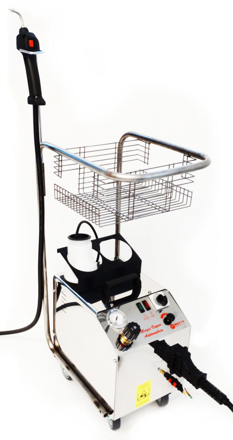 Professional accessory trolley specifically designed to enhance the mobility and organization of the MAGIC VAPOR SANI unit. It features dedicated compartments for easy transport of the steam generator, chemical containers, and cleaning tools, ensuring all sanitization essentials are within reach.